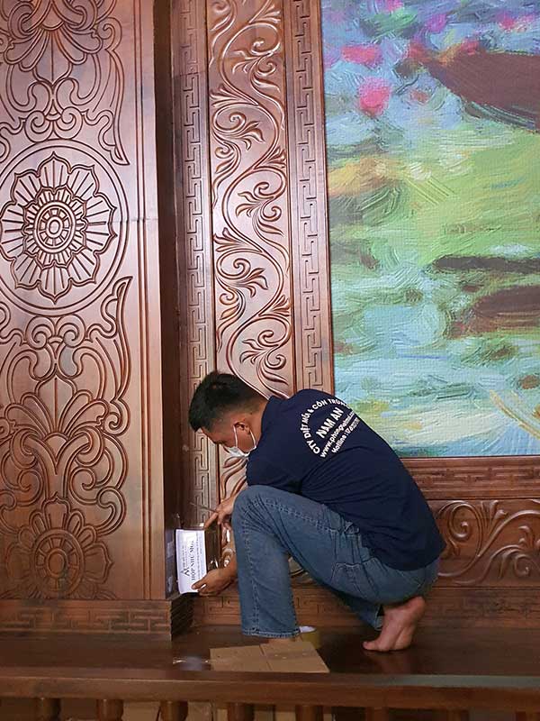 – Sau khi dỡ bỏ các hộp nhử, phun dung dịch thuốc phòng chống mối lên toàn bộ bên mặt, góc, kẽ, sàn gỗ, khuôn bao cửa, camri… các khu vực vừa xử lý mối.