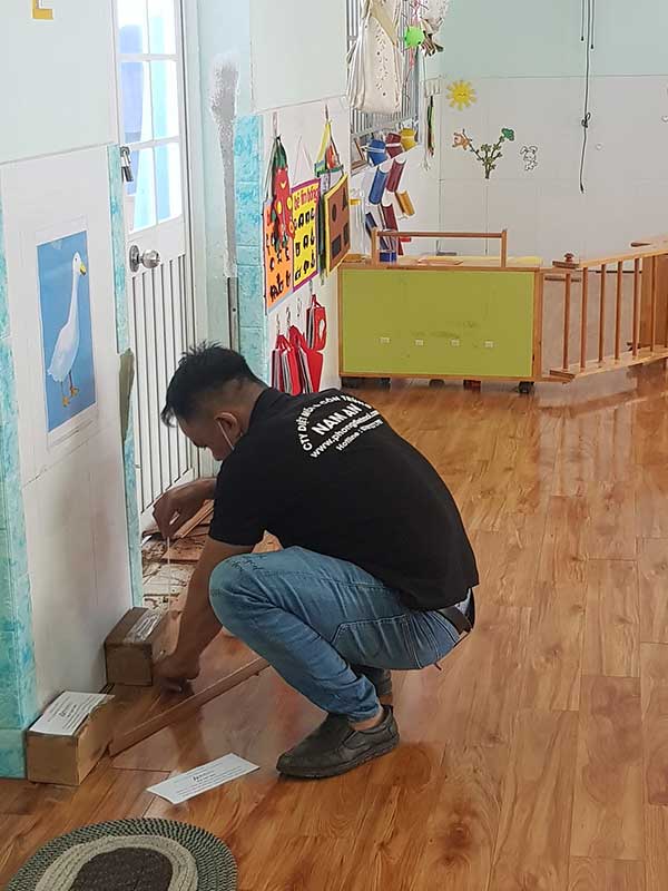 – Sau khi dỡ bỏ các hộp nhử, phun dung dịch thuốc phòng chống mối lên toàn bộ bên mặt, góc, kẽ, sàn gỗ, khuôn bao cửa, camri… các khu vực vừa xử lý mối.